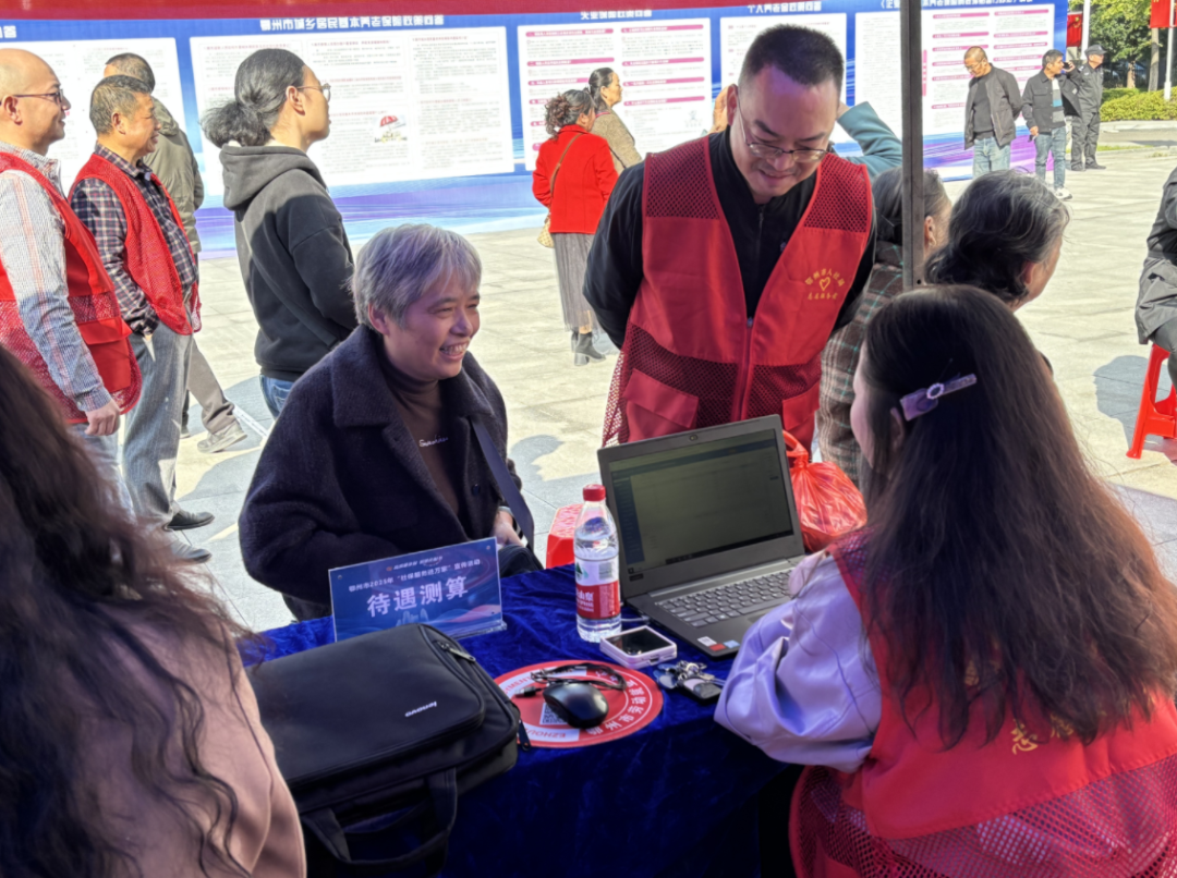 鄂州市“社保服務進萬家”主場活動現(xiàn)場,工作人員為即將退休的群眾測算社保待遇。