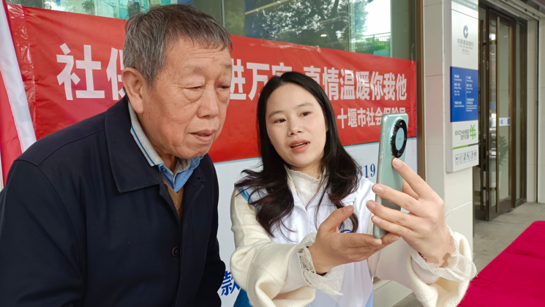 十堰市五堰建行“社銀合作”網(wǎng)點,工作人員向群眾演示社保業(yè)務“掌上辦”。