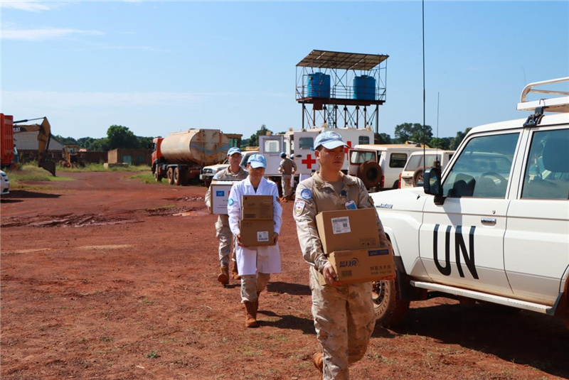 中國維和醫(yī)療分隊向當?shù)鼐栀涐t(yī)療物資。魯振輝攝