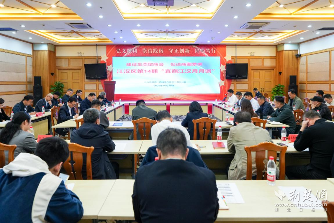 10月29日,江漢區(qū)第14期“宜商江漢月月談”聚焦“建設(shè)生態(tài)型商會(huì),促進(jìn)商圈繁榮”主題,邀請(qǐng)區(qū)內(nèi)重點(diǎn)商會(huì)、商業(yè)企業(yè)與相關(guān)部門代表面對(duì)面交流,圍繞營(yíng)商環(huán)境、政策支持、基礎(chǔ)設(shè)施等關(guān)鍵議題,現(xiàn)場(chǎng)收集意見建議,實(shí)現(xiàn)問(wèn)題在一線回應(yīng)、共識(shí)在一線凝聚、行動(dòng)在一線落實(shí)。