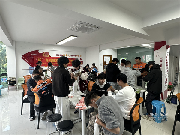 現(xiàn)場采用“1+1”結(jié)對模式,即1名新就業(yè)群體成員與1名老年人協(xié)作。年輕人負(fù)責(zé)填充艾草,老年人則憑豐富的生活經(jīng)驗,指導(dǎo)填充節(jié)奏和套枕套的技巧,兩代人配合默契?!捌綍r送餐趕時間,很少和社區(qū)老人聊上幾句,今天才發(fā)現(xiàn)他們懂這么多生活技巧,太厲害!” 一位外賣騎手一邊小心將艾草填入枕套,一邊笑著感慨,身旁的老人則熟練幫他封口打結(jié)。