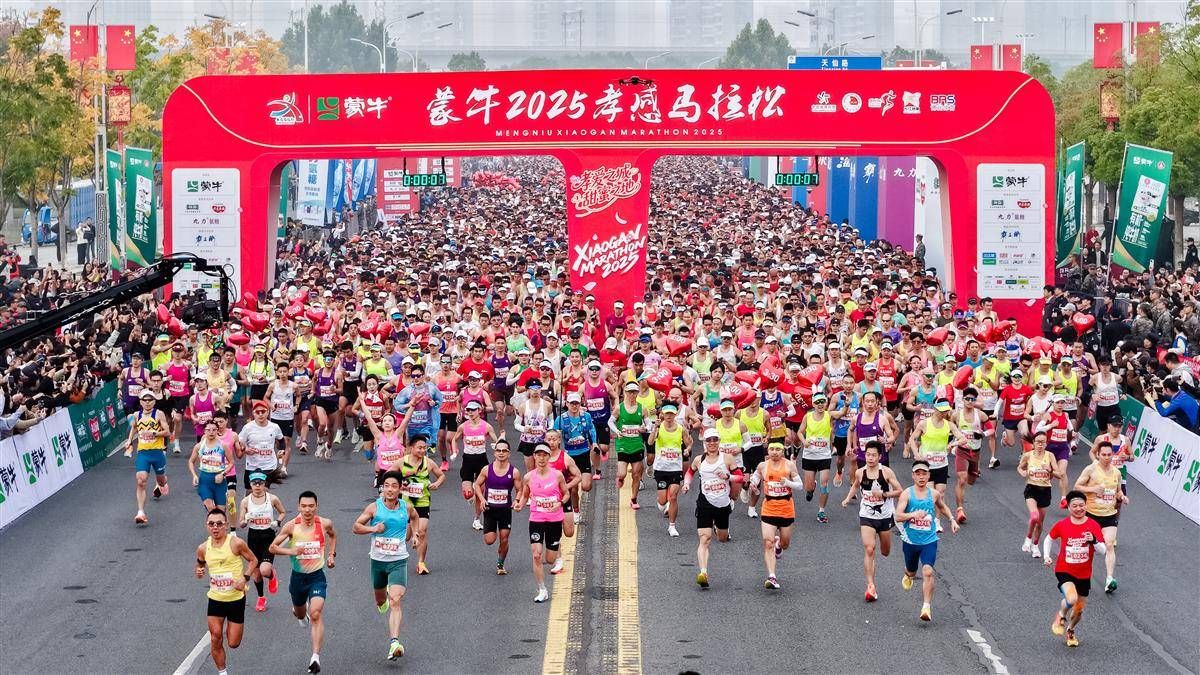 蒙牛2025孝感馬拉松選手沖過(guò)終點(diǎn)線(xiàn)。(孝感馬拉松組委會(huì)供圖)