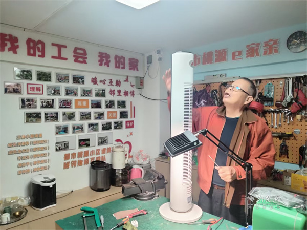 這個充滿煙火氣的共享工具空間,位于社區(qū)17棟架空層。雖面積不大,卻五臟俱全,墻上整齊擺放著螺絲刀、萬用表、扳手、電鉆等各類工具,操作臺上堆滿居民送來的待修物品。來自小區(qū)的退休工程師志愿者分工明確,有的排查小家電故障,有的調(diào)試自行車零件,耐心傾聽需求、細致檢查物品,用專業(yè)素養(yǎng)贏得居民信賴。