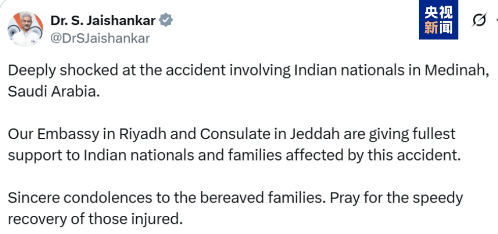 蘇杰生發(fā)表聲明稱,對在麥地那發(fā)生的涉及印度公民的事故深感震驚,并稱印度駐利雅得大使館和駐吉達(dá)領(lǐng)事館正在全力支持受此次事故影響的印度公民及其家屬。(總臺(tái)記者 張玥 張亞寧)