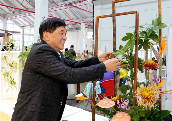 辛高爐帶來《誰不說咱家鄉(xiāng)好》等插花作品,以菊為語,以景傳情,展現(xiàn)樸素的鄉(xiāng)土情懷。他表示:“每一件插花作品都是一個微縮的園藝課堂,它們不僅是技藝的展示,更是故事的載體,詮釋著人與自然和諧共生的主題?!?/p>