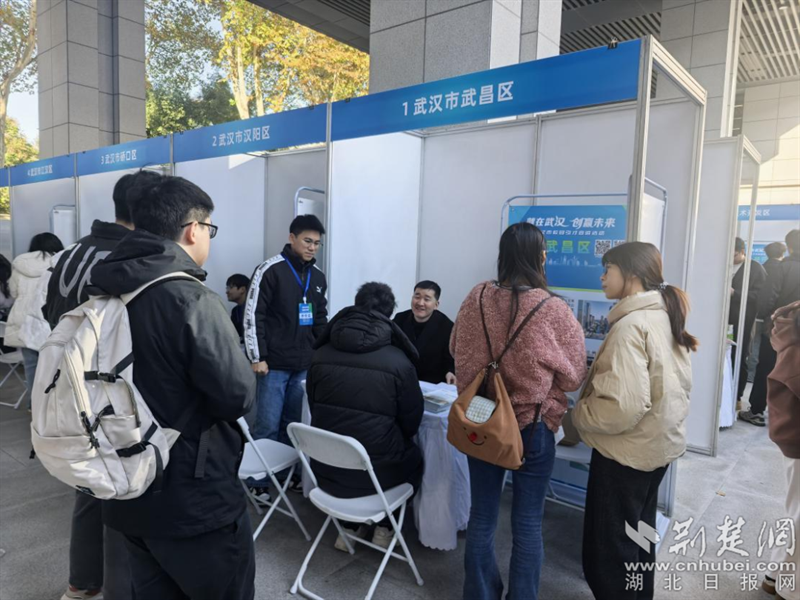 應(yīng)屆畢業(yè)學(xué)子在武昌區(qū)展臺(tái)前了解咨詢(xún)政策。