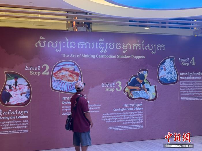 當(dāng)?shù)貢r(shí)間11月25日,《時(shí)光之影》皮影特展在金邊展出多件柬埔寨傳統(tǒng)皮影作品。圖為一名觀眾在觀看柬埔寨大皮影制作工藝展示墻?!?qiáng)寶儀 攝