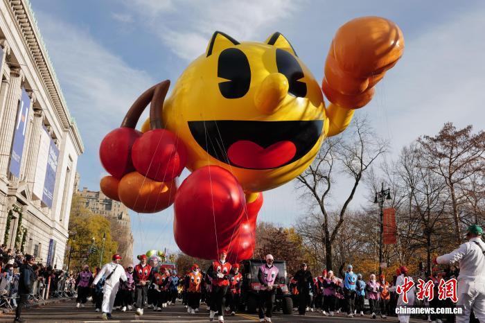 當(dāng)?shù)貢r(shí)間11月27日,第99屆梅西百貨感恩節(jié)大游行在美國紐約舉行。圖為“吃豆人”巨型氣球首次亮相紐約感恩節(jié)大游行?!≈行律缬浾?王帆 攝