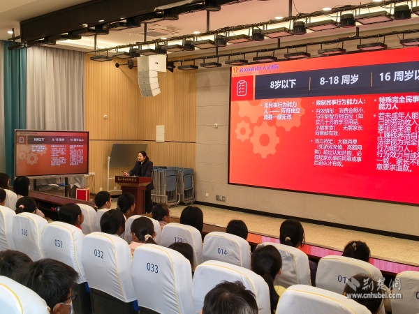 活動中,武昌區(qū)人民法院白沙洲法庭余意法官以《未成年人民事法律行為效力》為題,用“未成年人網(wǎng)購貴重物品是否有效”等案例,按年齡分層解析法律責任邊界,讓學生快速厘清不同階段的民事行為效力,直觀感受憲法及民事法律對青少年權益的保護。