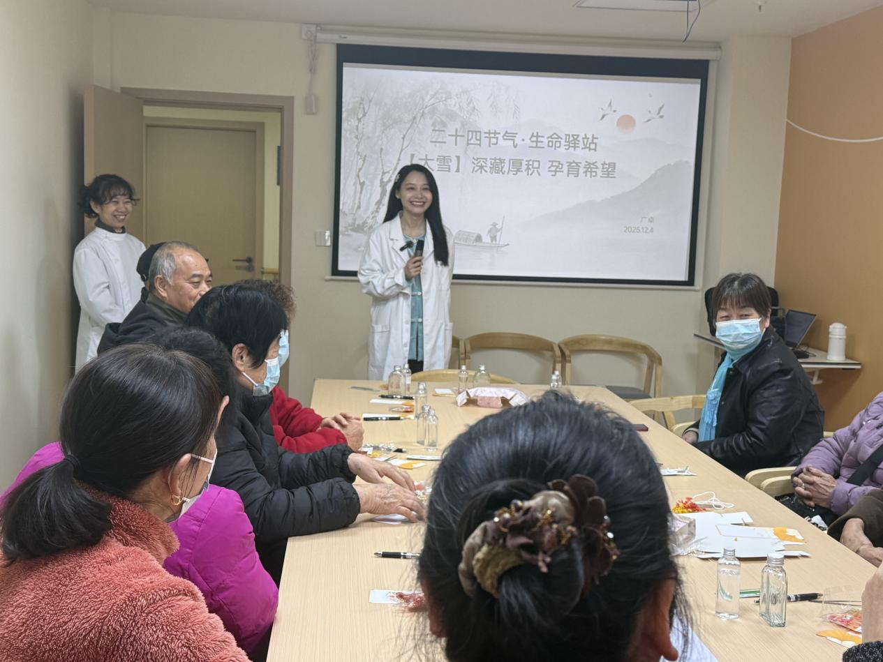 12月4日下午,武漢市洪山區(qū)梨園街道綜合養(yǎng)老服務(wù)中心內(nèi)暖意融融、靜穆有序,“大雪?深藏厚積,孕育希望”二十四節(jié)氣心理團(tuán)輔活動(dòng)在此溫情開(kāi)展。本次活動(dòng)由武漢大學(xué)中南醫(yī)院血液內(nèi)科聯(lián)合東湖社區(qū)衛(wèi)生服務(wù)站、梨園街道綜合養(yǎng)老服務(wù)中心、家庭健康服務(wù)中心共同舉辦,并獲韓紅基金會(huì)贊助。以“大雪”節(jié)氣為文化紐帶,深度融合傳統(tǒng)智慧與現(xiàn)代心理關(guān)懷,旨在為轄區(qū)老年人提供一場(chǎng)溫暖而深入的心理團(tuán)輔。