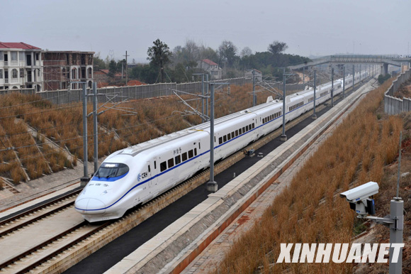 12月26日9時(shí)16分,從武漢始發(fā)的首列動(dòng)車組列車快速通過(guò)湖北咸寧北站。 當(dāng)日,武廣高鐵正式通車運(yùn)營(yíng),標(biāo)志著我國(guó)步入高速鐵路新時(shí)代。 新華社記者 皮曙初 攝