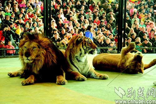 圖為:虎年最受追捧的當(dāng)屬武漢動物園的“小虎隊”,表演場次較平時增加一倍。 記者劉茜通訊員何志華攝