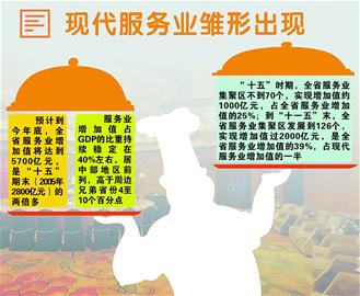 五年來,全省不斷改造提升傳統(tǒng)服務(wù)業(yè),大力發(fā)展需求潛力大的現(xiàn)代服務(wù)業(yè),鞏固提高商貿(mào)等支柱服務(wù)業(yè)的整體規(guī)模和水平,實(shí)現(xiàn)了多個新興行業(yè)和關(guān)鍵領(lǐng)域的重點(diǎn)突破,基本形成了二、三產(chǎn)業(yè)共同拉動經(jīng)濟(jì)又好又快增長的格局。省發(fā)改委表示,下一個5年,我省將力爭形成物流、旅游、金融、文化、信息、中介6個增加值或收入過千億元的現(xiàn)代服務(wù)業(yè)產(chǎn)業(yè),力爭服務(wù)業(yè)增加值實(shí)現(xiàn)過萬億元的突破,占全省GDP比重達(dá)到43%。